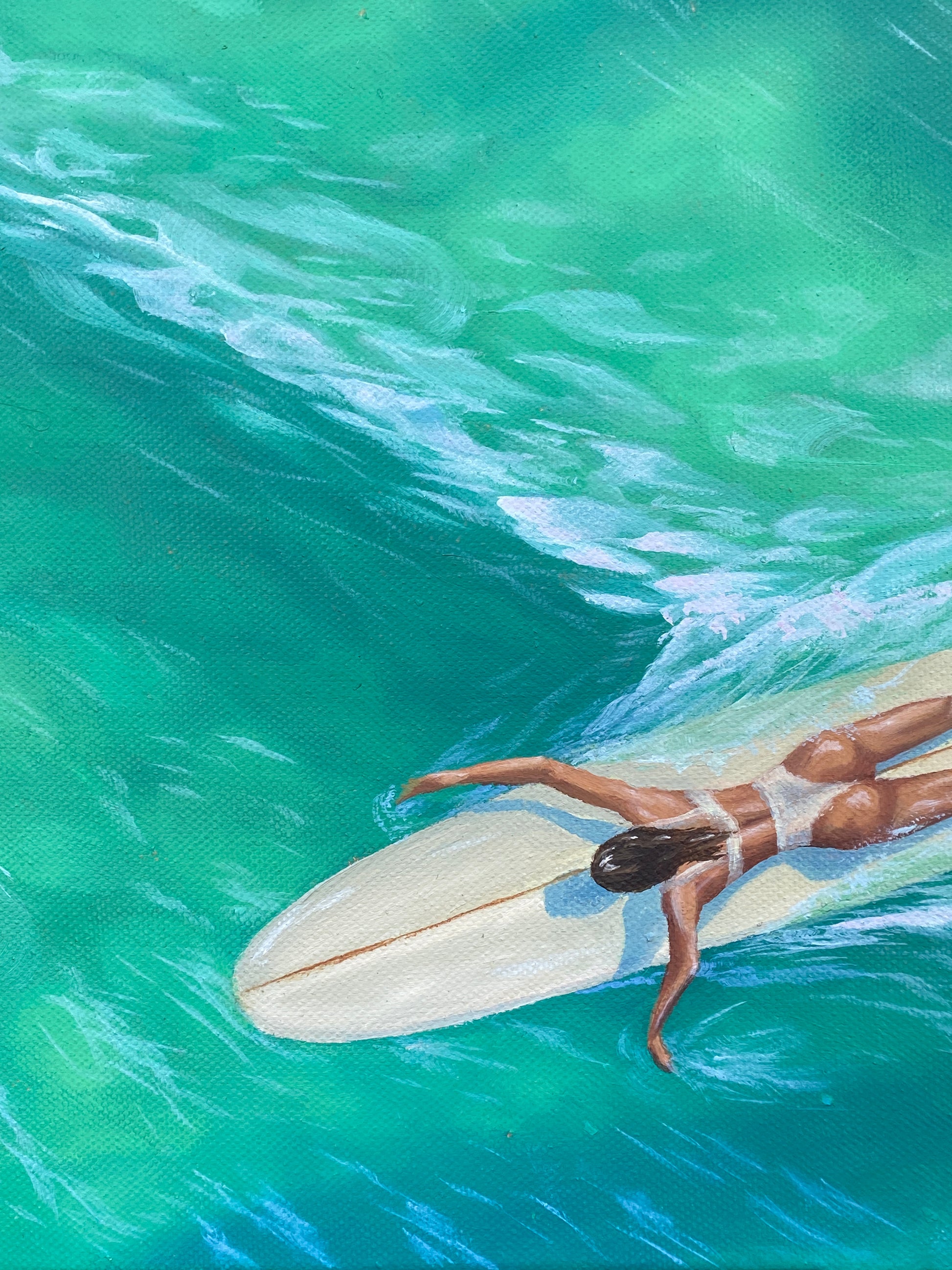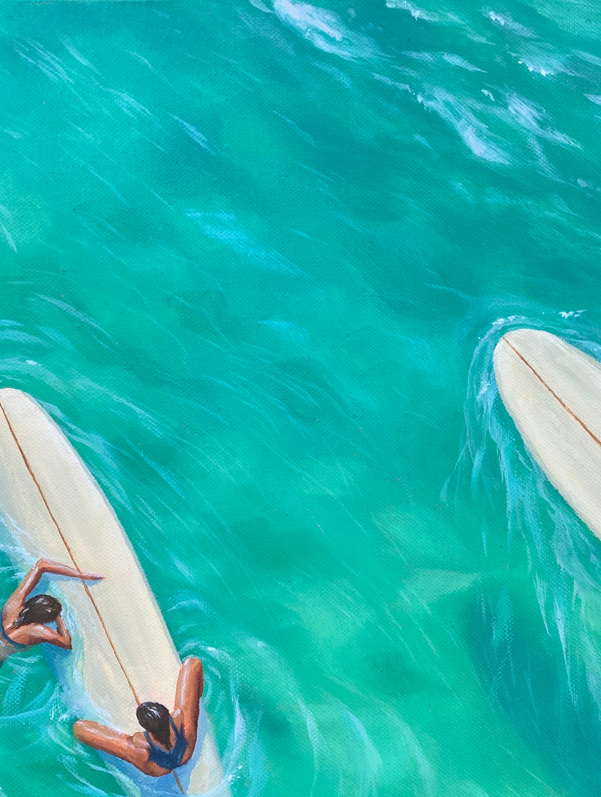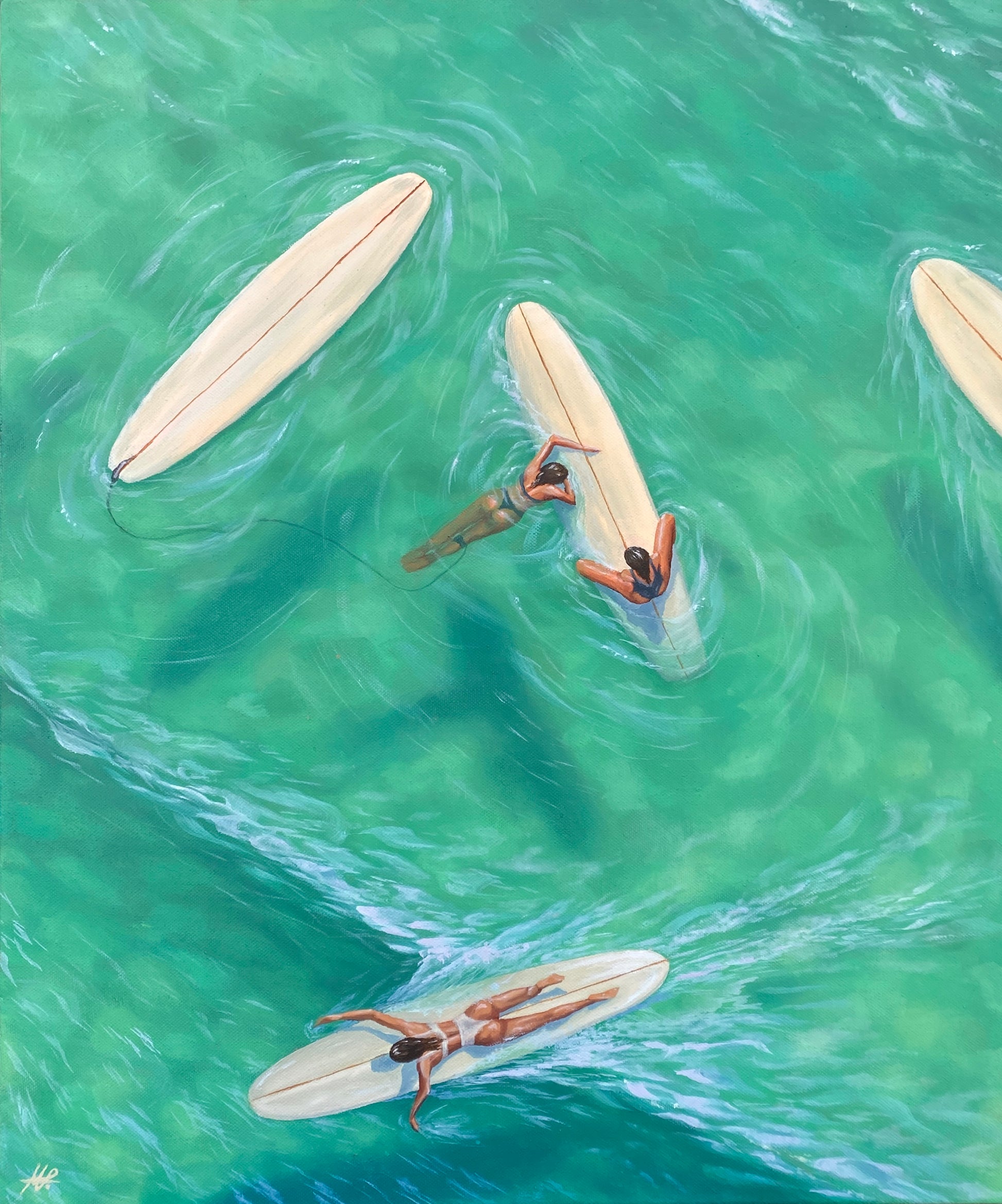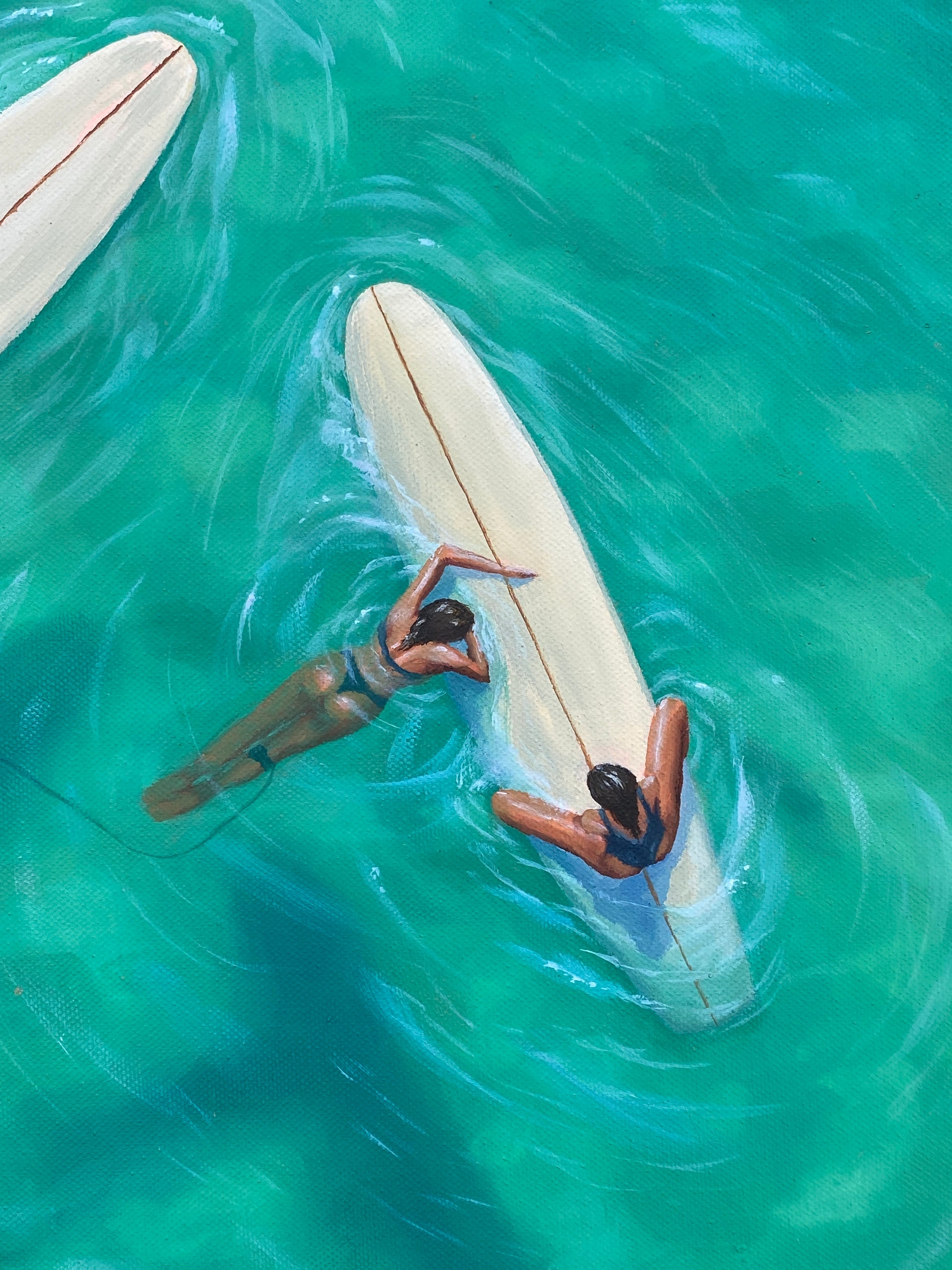 'Morning Meetings' is a celebration of friendship, inspired by the all-important chats with beloved surf sisters. Surrounded by turquoise water and peeling waves we bask in the opportunity to connect, with a cheeky play on the feminine desire for closeness and conversation wherever and whenever possible. Even if it is in the middle of the line up...